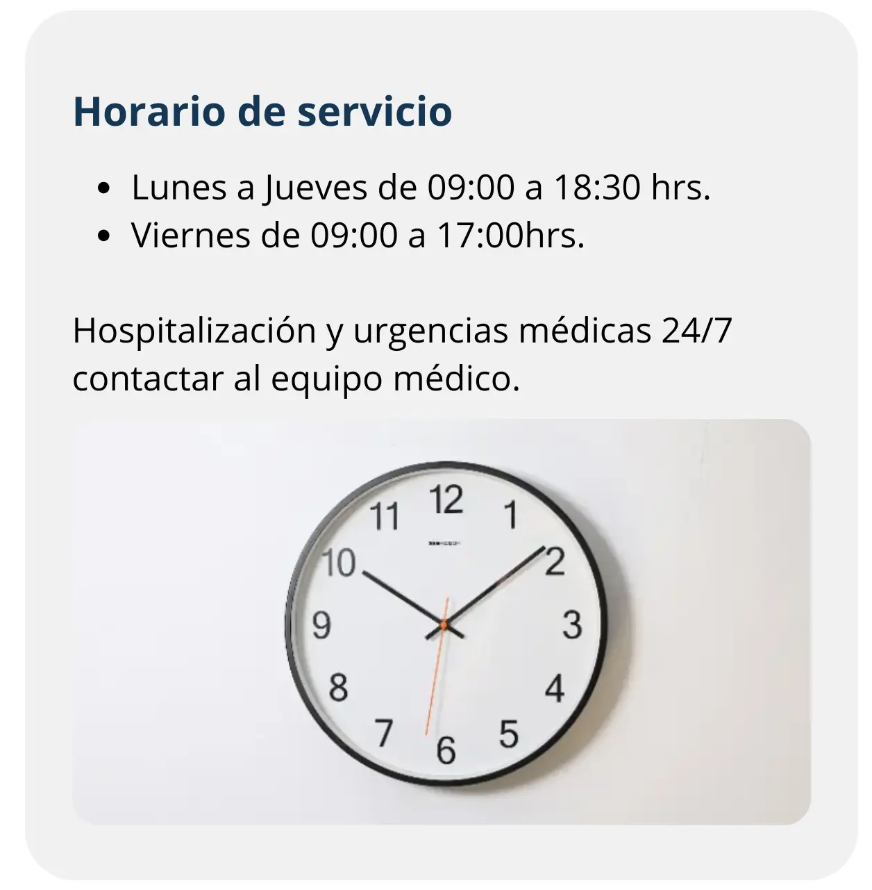 Hospitalización y urgencias médicas 24/7 contactar al equipo médico.